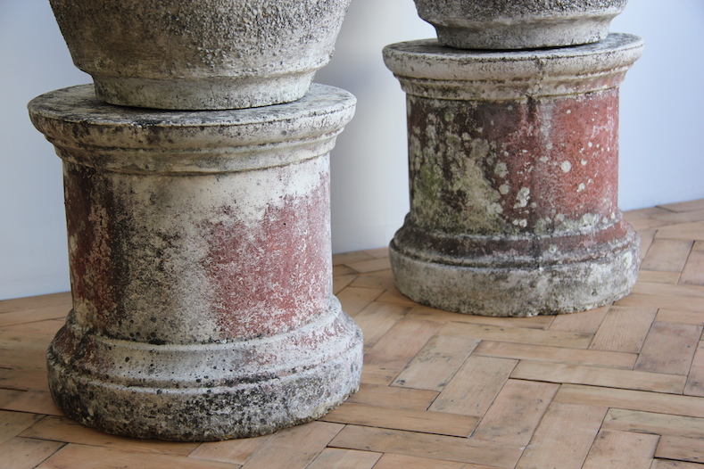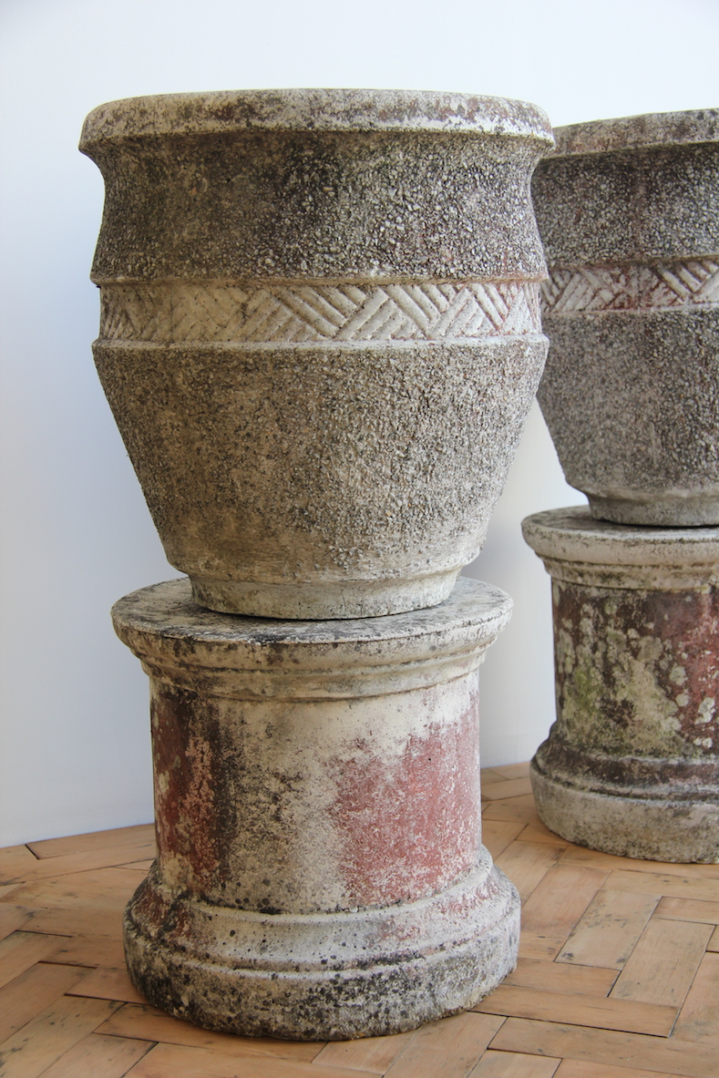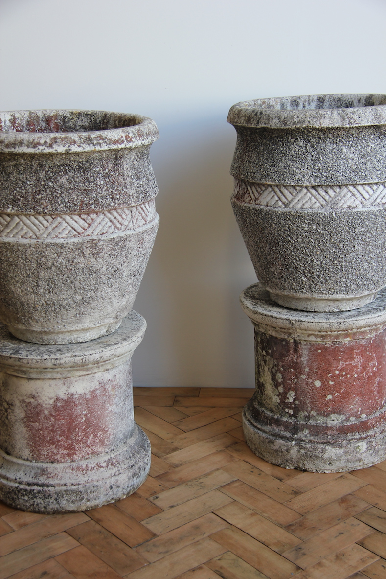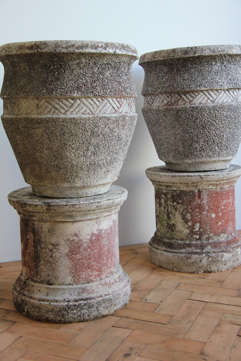 Reconstituted stone planters, in original weathered condition they would date to the mid 20th century, two pots – two stands the price is for the pair. Any further enquires please feel free to ask. Measurements to follow.