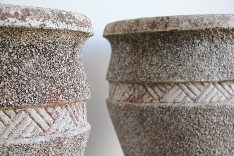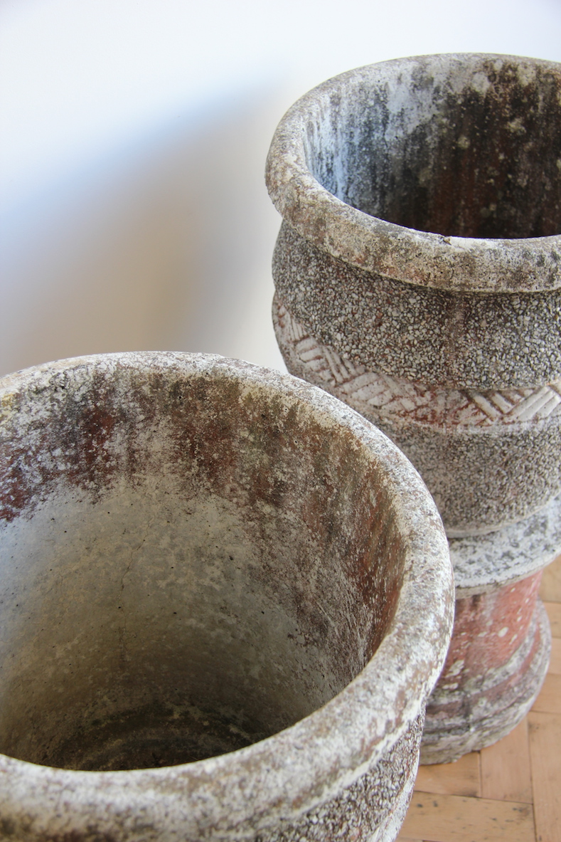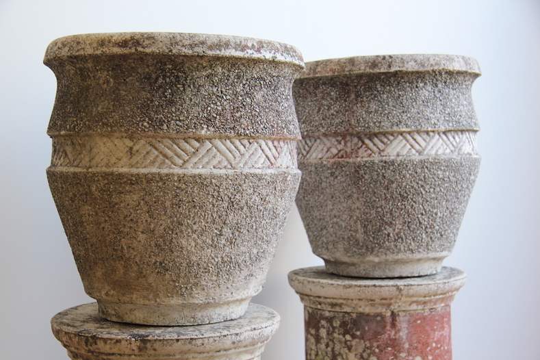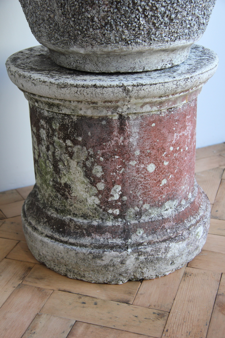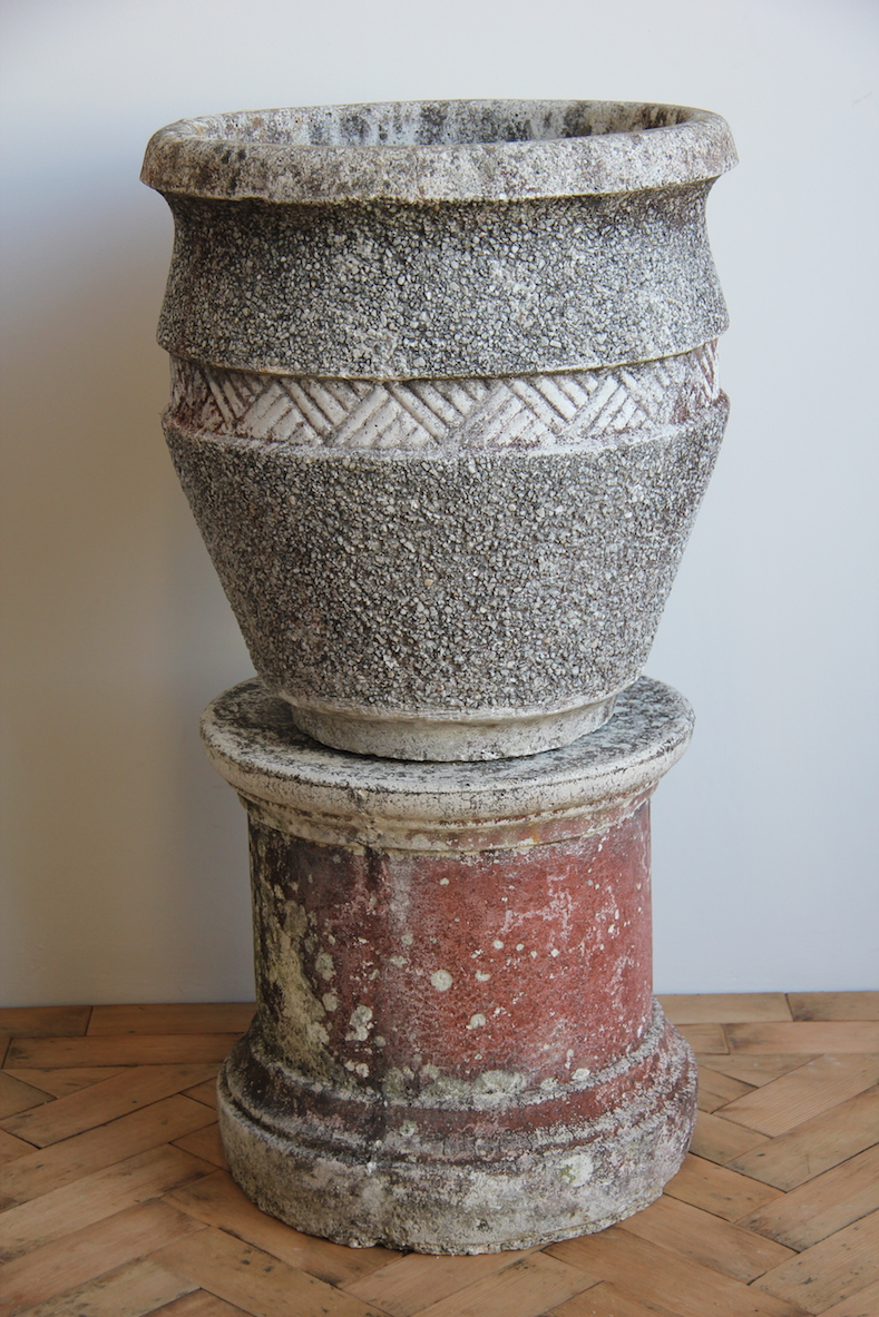 Reconstituted stone planters, in original weathered condition they would date to the mid 20th century, two pots – two stands the price is for the pair. Any further enquires please feel free to ask. Measurements to follow.