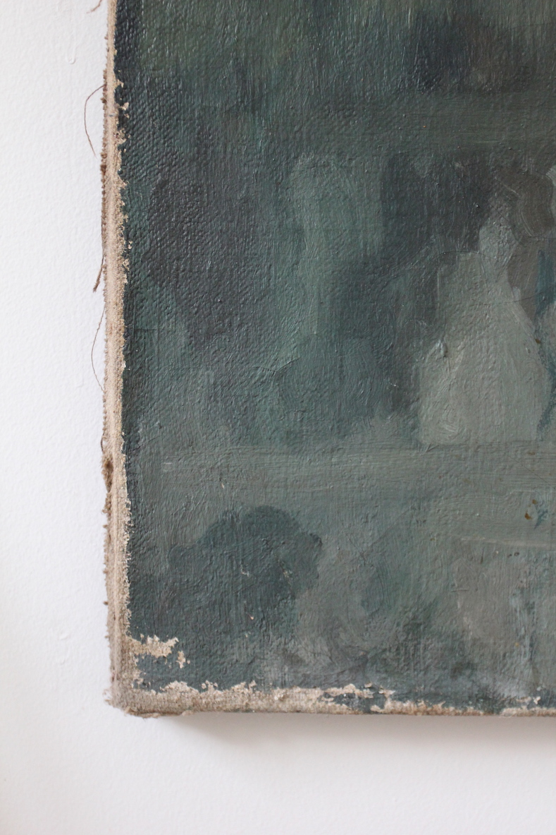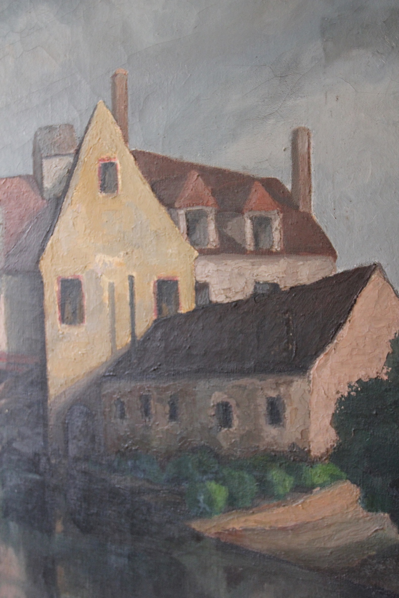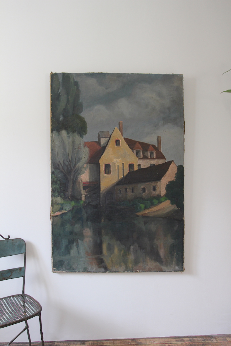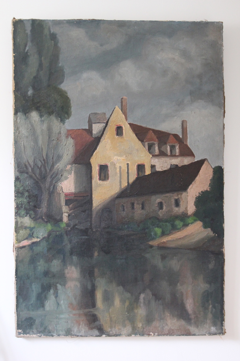 A large imposing 19th-century oil on canvas, crudely painted by an amateur french artist, the picture depicts a house situated on a river bank surrounded by trees. Any further inquiries please feel free to ask.