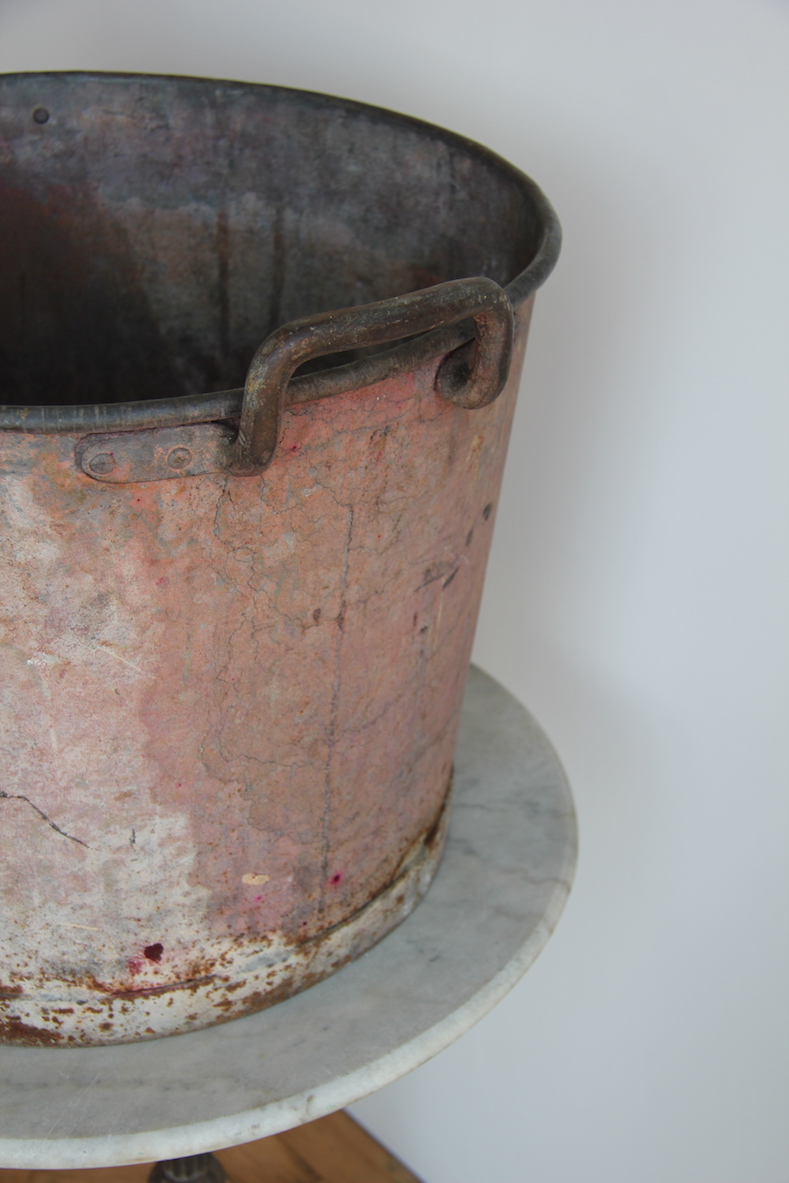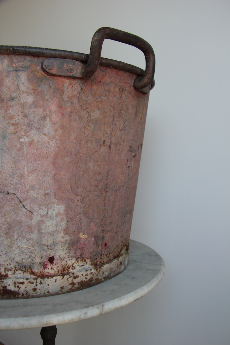 A galvanised French tub painted pink many years ago it has large industrial handles. Any further enquires please feel free to ask.